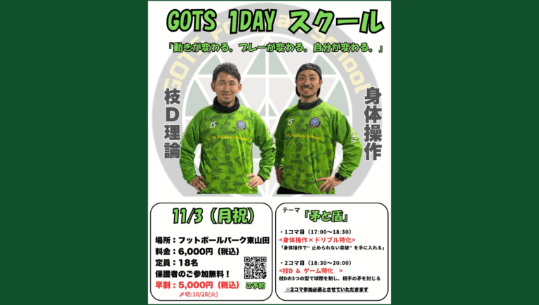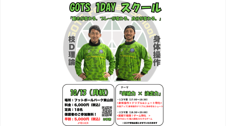 2025年10月13日(㊗️月)GOTSの祝日限定イベント「GOTS1DAYスクール」を開催します! 今回のイベントのテーマは、「突破力」×「決定力」 選手ならきっと誰もが欲しいこの2つの力。その力をどうやって伸ばすのか