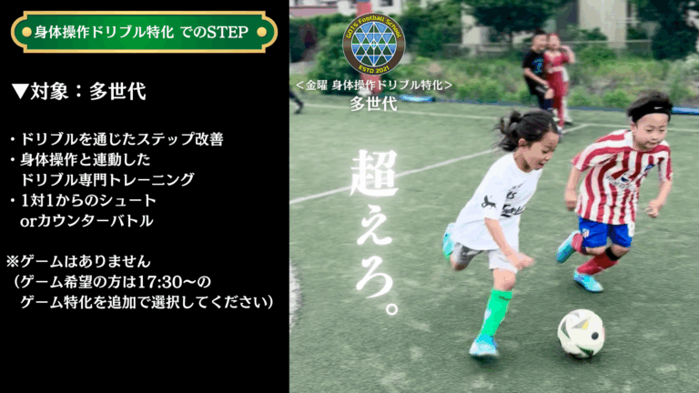 🟢ご案内 かねてよりお問い合わせの多かった「金曜 身体操作ドリブル特化」への単発参加。 試験的にではありますが、2025年10月10日(金)より 単発参加OK となりました! (※場合によっては戻す可能性もありますので、