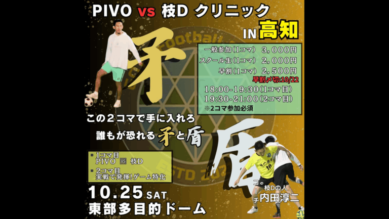 2025年10月25日(土)、【GOTS特別イベント】として「PIVO vs 枝Dクリニック」を開催します! 〈1コマ目〉では、 身体や腕を使ったその場のボールキープから、しなやかでスピードに乗った反転まで。 そして、球