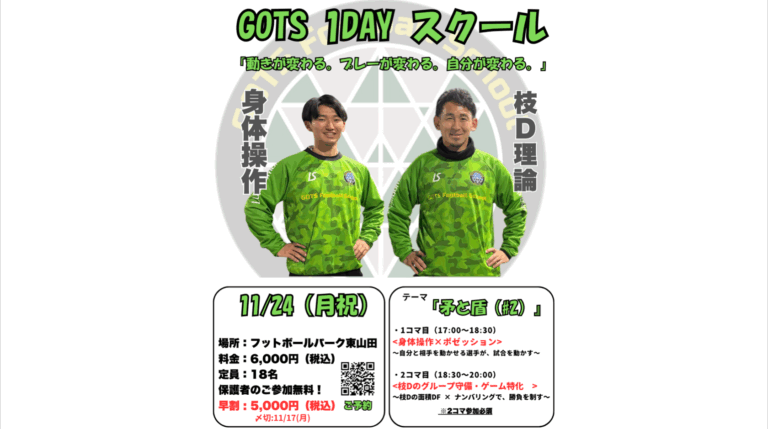 2025年11月3日(㊗️月)@東山田会場GOTSの祝日限定イベント「GOTS1DAYスクール」を開催します! 今回のイベントのテーマは、【 ⚔️矛と盾🛡️ 】 「1対1を制するものは試合を制す…」 フットボ